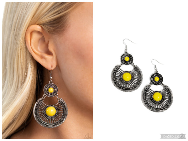 Dotted with a dainty Illuminating bead, a studded silver circular frame links with a crescent shaped silver frame radiating with studded linear and circular patterns. An oversized Illuminating bead adorns the center of the lowermost frame, complementing the colorfully rustic display. Earring attaches to a standard fishhook fitting.