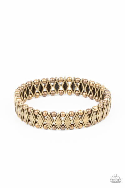 Brushed in an antiqued shimmer, pairs of dainty brass beads flank diamond shaped brass beads along stretchy bands around the wrist for a rustic fashion.