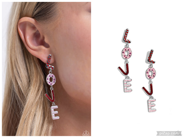 Silver letters with various Valentine's-inspired details spell out the word "LOVE" as they vertically cascade down the ear in a flattering finish. The "L" features red-painted hearts, the "O" features a baby pink background with fuchsia rhinestones and dainty white pearls, the "V" features a red glitter backdrop, and the "E" features stripes of white and baby pink. Each of the letters are interconnected to one another, infusing the design with some playful movement. Earring attaches to a standard post fitting.