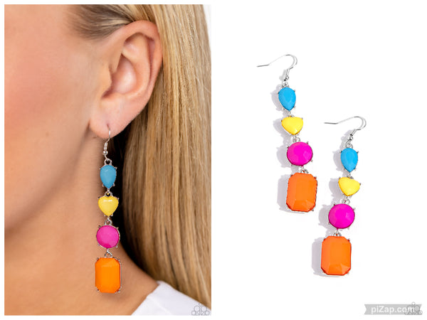 Varying in shape, glistening faceted blue, Primrose, Fuchsia Fedora, and Orange Tiger beads are encased in studded silver frames as they delicately link into a colorful lure. Earring attaches to a standard fishhook fitting.