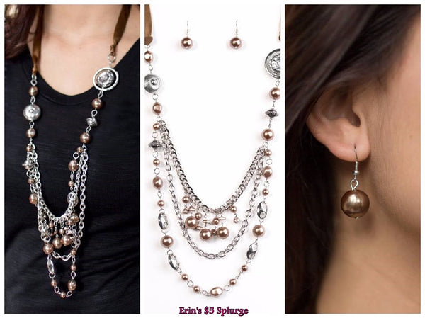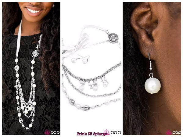 A silky ribbon replaces a traditional chain to create a timeless look. Pearly beads and funky silver pieces intermix with varying lengths of silver chains to give a fresh take on a Victorian-inspired piece.