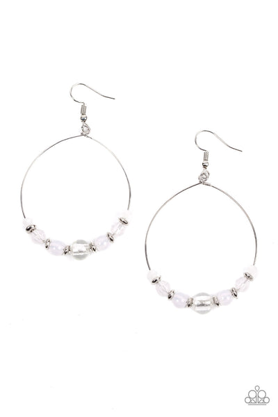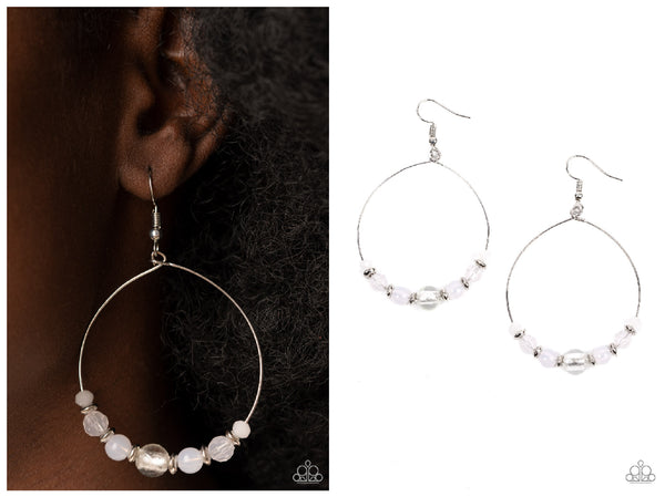Infused with dainty silver accents, opaque and glassy white beads glide along a wire hoop for an ethereal pop of color. Earring attaches to a standard fishhook fitting.