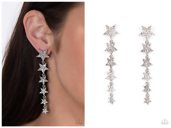Dotted with dainty white rhinestones, a stellar collection of silver stars graduate in size as they cascade from the ear for an out-of-this-world fashion. Earring attaches to a standard post fitting.