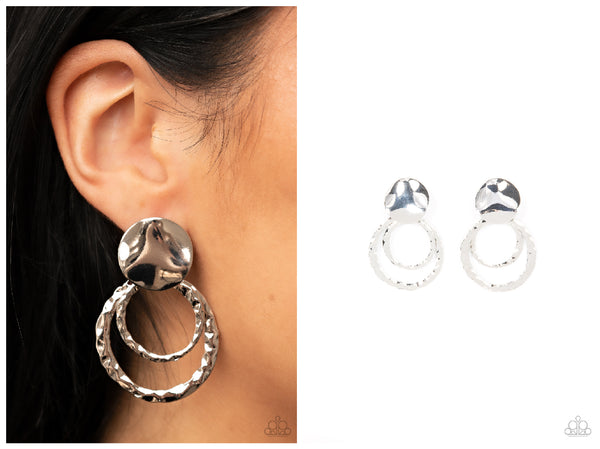 Two shiny hammered silver circles swing from a wavy silver disc, creating a captivating lure. Earring attaches to a standard post fitting.