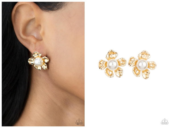A generous pearl bead dots the center of an apple blossom bloom brushed in gold shimmer creating an enchantingly dreamy allure. Earring attaches to a standard post fitting.