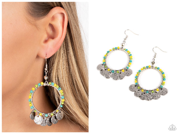 Textured silver discs chime at the bottom of a silver wire hoop. Dainty blue, green, and yellow seed beads are threaded along an invisible wire and wrapped around the hoop for a bohemian vibe. Earring attaches to a standard fishhook fitting.