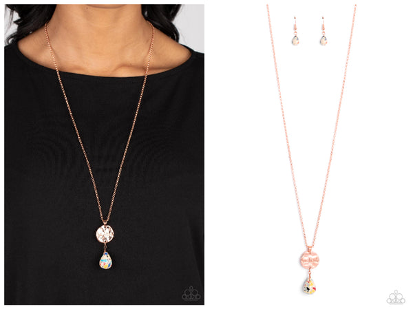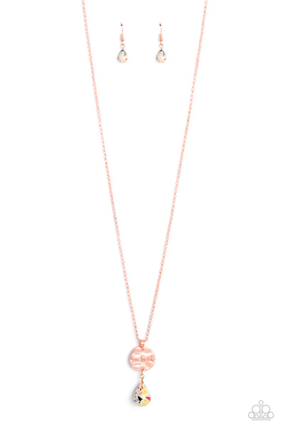 Swinging from a dainty shiny copper chain, a hammered disc in the same hue is stamped with the words "be kind." A chiseled stone teardrop painted with multicolored flecks hangs from the bottom of the pendant adding a fashionably rustic feature. Features an adjustable clasp closure. As the stone elements in this piece are natural, some color variation is normal.