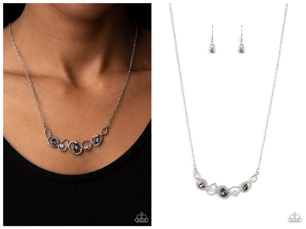 An incandescent assortment of shiny silver frames, dainty white rhinestones, and oversized smoky gems delicately coalesce into a statement-making sparkle below the collar. Features an adjustable clasp closure.