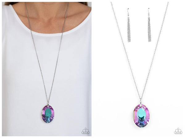 Featuring a blue reflective focal point and an exaggerated faceted surface, a dramatically oversized, purple iridescent gem sparkles at the bottom of a lengthened silver chain for an out-of-this-world kind of dazzle. Features an adjustable clasp closure. Due to its prismatic palette, color may vary.