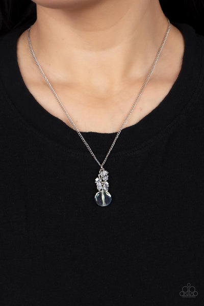 A faceted iridescent gem-like bead swings from the bottom of a beaded tassel, creating a twinkly pendant below the collar. Features an adjustable clasp closure.