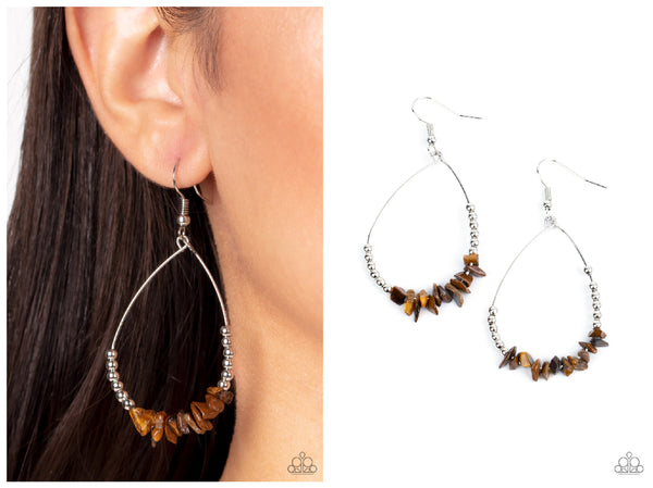 Dainty silver beads flank a row of refreshing tiger's eye rock beads along a dainty silver wire, creating an earthy teardrop frame. Earring attaches to a standard fishhook fitting.