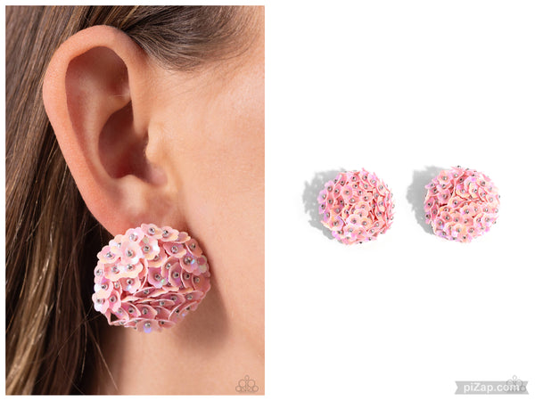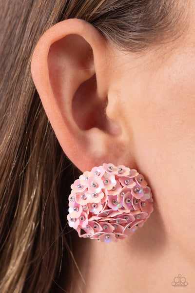 Featuring a light iridescent sheen, light pink flowers with silver stud centers explode around the ear to create a whimsical bouquet-inspired statement. Earring attaches to a standard post fitting.