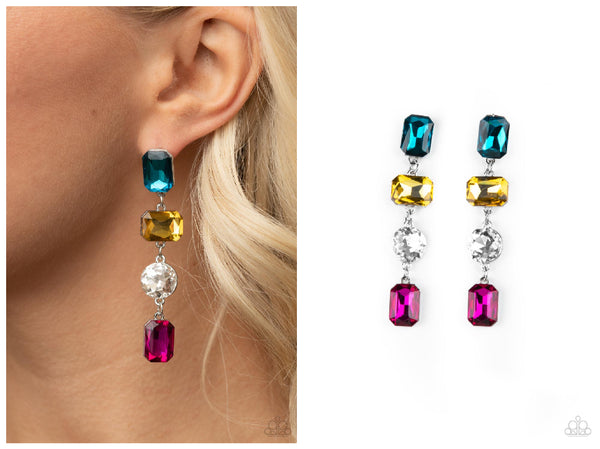A strand of oversized round, teardrop, and emerald cut blue, yellow, white, and pink rhinestones trickles from the ear, creating a jaw-dropping chandelier. Earring attaches to a standard post earring.