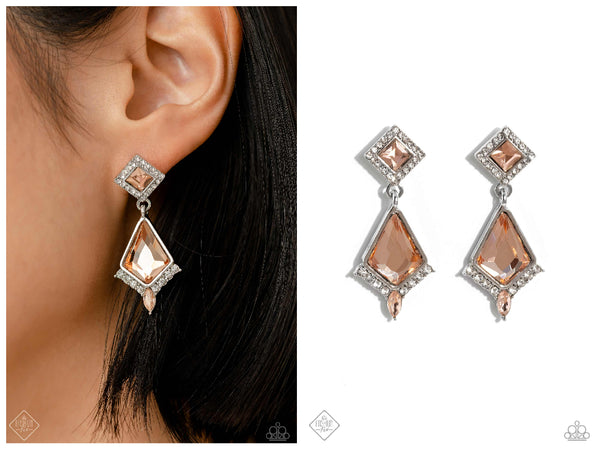 A peach square-cut gem is wrapped in glitzy white rhinestones and tilted on its side, creating a bold anchoring point. A large kite-shaped gem in the same peachy hue swings below, fiercely showcasing the sparkling rhinestones that line its bottom edge. A solitaire marquise-cut gem drips between the lustrous display, adding a surprising pop of color in an elegant finish. Earring attaches to a standard post fitting.