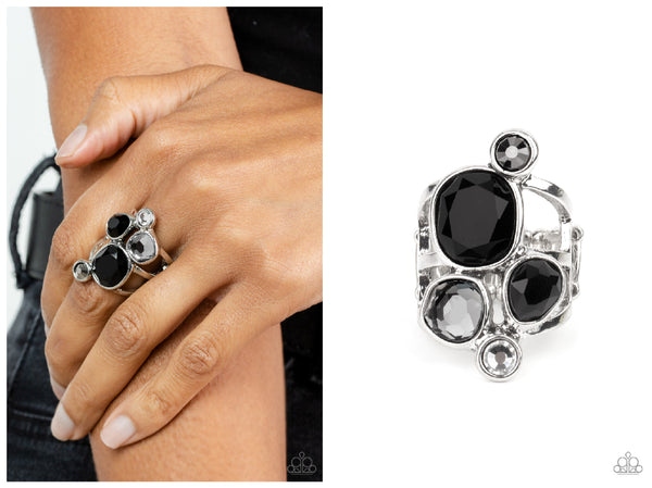 A collection of sparkling black and hematite gems in varying sizes, accented by a single white rhinestone, forms an asymmetrical cluster atop the finger. Set in sleek silver frames over airy silver bands, the brilliant gems demand full attention. Features a stretchy band for a flexible fit.