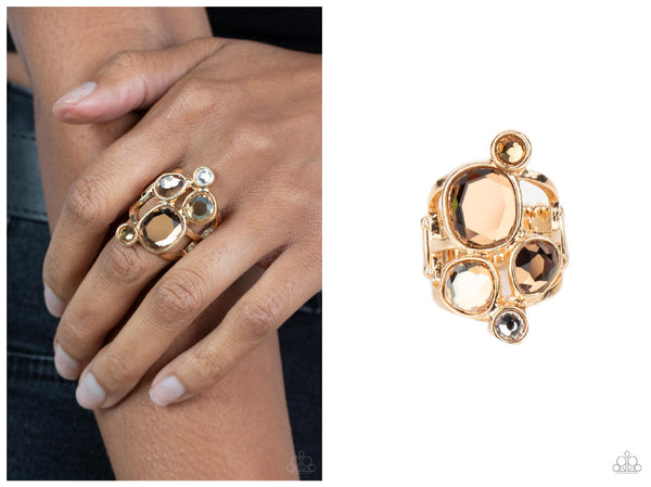 A collection of sparkling champagne-colored gems in varying sizes, accented by a single white rhinestone, forms an asymmetrical cluster atop the finger. Set in sleek gold frames over airy gold bands, the brilliant gems demand full attention. Features a stretchy band for a flexible fit.