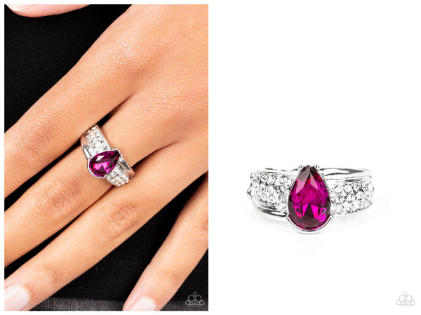 Swathed in rows of dainty white rhinestones, an asymmetrical silver band is adorned with a bedazzling pink teardrop rhinestone for a regal finish. Features a dainty stretchy band for a flexible fit.