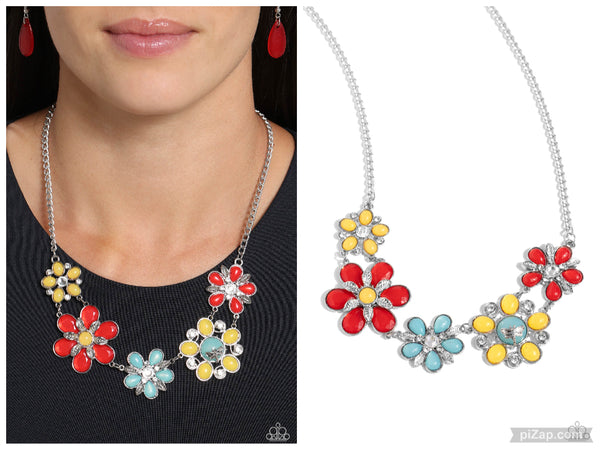 Dotted with white rhinestone and yellow and turquoise beaded centers, a flirtatious assortment of red, yellow, and turquoise flowers link below the collar for a playful pop of color. Textured silver leaves and rhinestone-embellished swirls bloom amongst the petals and from the shimmery centers for additional eye-catching texture. A dainty silver dragonfly charm perches atop one of the flowers for a free-spirited finish. Features an adjustable clasp closure.