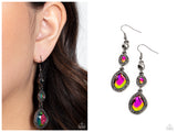 Bordered in gunmetal frames dotted with tiny flecks of hematite rhinestones, a pair of asymmetrical gems with an oil-spill finish delicately link into a spellbinding sparkle around the ear. Earring attaches to a standard fishhook fitting.