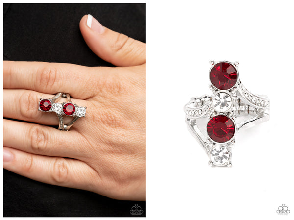 Attached to plain silver bands and white rhinestone encrusted silver bands, pairs of white and red rhinestones duplicate down the finger for a dazzling finish. Features a dainty stretchy band for a flexible fit.