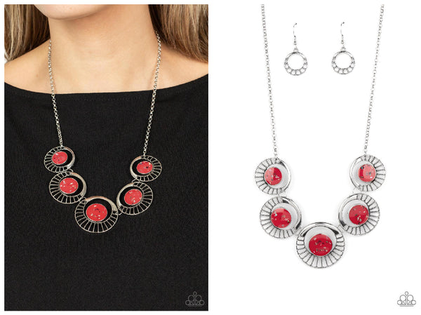 Flecked with shell-like accents, shiny Fire Whirl frames adorn the centers of circulating silver frames below the collar. Featuring studded silver spokes that flair out from the bottom, the colorful frames gradually increase in size for a dizzying finish. Features an adjustable clasp closure.