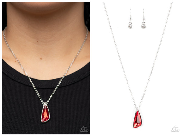 An asymmetrical red gem is pressed into a shiny silver frame dusted in glassy white rhinestones, resulting in a refined pendant at the bottom of a dainty silver chain. Features an adjustable clasp closure.