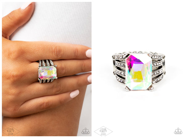 Featuring a regal emerald style cut, an oversized iridescent gem is pressed into the center of stacked silver bands radiating with dainty white rhinestones for a dramatic look. Features a stretchy band for a flexible fit.