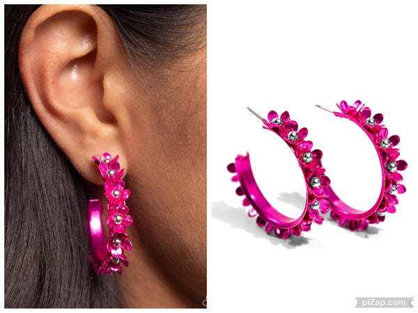 Dipped in a hot pink hue, a hollowed-out hoop curls around the ear. Featuring silver beaded centers, metallic hot pink flowers bloom along the curl of the hollow of the hoop for a fashionable display. Earring attaches to a standard post fitting. Hoop measures approximately 1 1/4" in diameter.