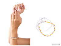 Threaded along stretchy bands around the wrist, a strand of white seed beads combines with a multicolored strand of seed beads to create a stunning pop of color. White cube beads are infused on each strand, spelling out the phrase "find peace" between them, creating inspirational layers.