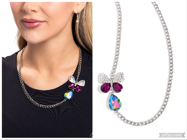 Infused along a silver chain, an oversized butterfly flutters above a UV shimmery teardrop. The upper wings of the butterfly feature white rhinestones, while the bottom wings are formed from faceted magenta teardrops for a whimsical finish. Features an adjustable clasp closure. Due to its prismatic palette, color may vary.