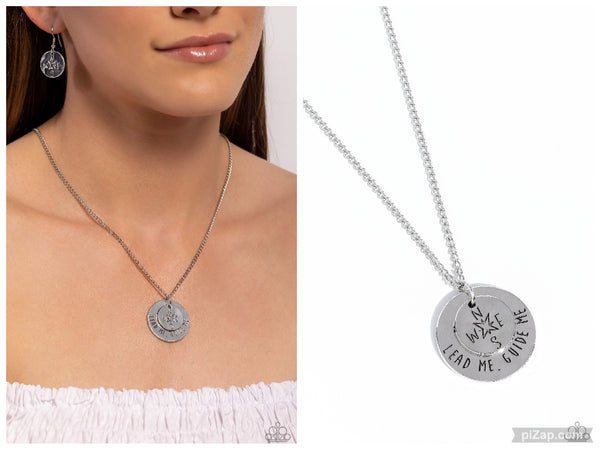 Two varying sizes of interconnected silver discs brushed in an antiqued grit swing below a classic silver chain. The oversized disc features the phrase "Lead Me, Guide Me" as the font curves up around the upper disc. The smaller, uppermost disc is stamped with a simple compass design, following its inspirational motif. Features an adjustable clasp closure.