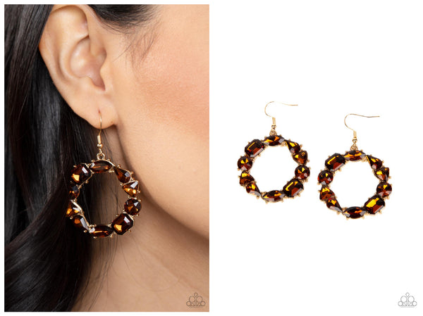 Featuring glistening gold fittings, a regal assortment of round, triangular, teardrop, marquise, and emerald cut topaz rhinestones delicately coalesce into a jaw-dropping hoop. Earring attaches to a standard fishhook fitting.