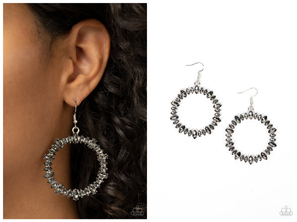 Encased in pronged silver fittings, a smoky collection of marquise cut rhinestones delicately coalesce into a brilliant hoop for a show-stopping finish. Earring attaches to a standard fishhook fitting.