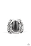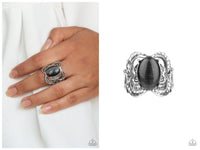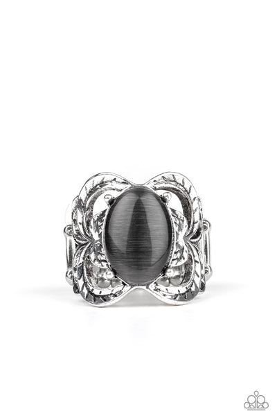 A glowing black cat's eye stone is pressed into the center of a shimmery silver frame etched in leafy details for a whimsical look. Features a stretchy band for a flexible fit.
