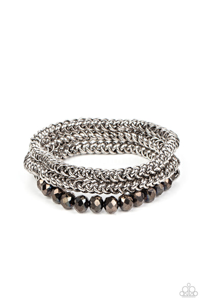 Threaded along stretchy bands, sections of hematite crystal-like beads and interlocking silver chains layer around the wrist for a dash of glitzy grunge.