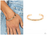 A simplistic, shiny, gold cuff is stamped with the phrase "I Stand All Amazed," for a divine, light-catching design across the wrist.