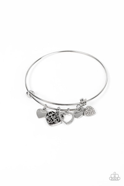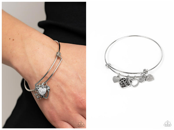 Featuring shiny silver, white rhinestones, and filigree-filled finishes, a mismatched collection of dainty heart charms glides along a silver bar fitting at the center of the wrist for a romantic flair.