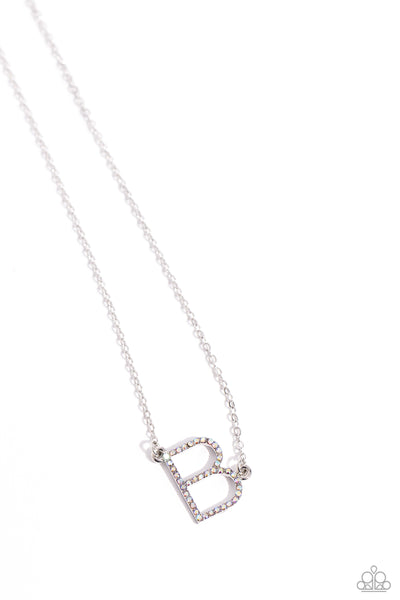 Embossed with dainty iridescent rhinestones, a silver letter "B" hovers below the collar from a dainty silver chain, for a sentimentally simple design. Features an adjustable clasp closure. Due to its prismatic palette, color may vary.