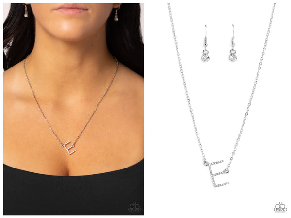 Embossed with dainty white rhinestones, a silver letter "E" hovers below the collar from a dainty silver chain, for a sentimentally simple design. Features an adjustable clasp closure.