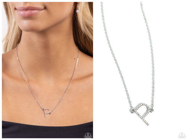 Embossed with dainty iridescent rhinestones, a silver letter "P" hovers below the collar from a dainty silver chain, for a sentimentally simple design. Features an adjustable clasp closure. Due to its prismatic palette, color may vary.