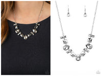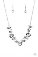 Featuring smoky and glitzy hematite finishes, a mismatched collection of emerald, square, and teardrop cut gems delicately connects below the collar for a stellar statement. Features an adjustable clasp closure.