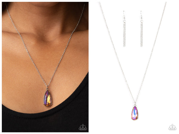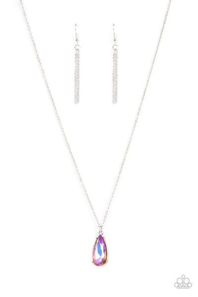 Encased in a shiny silver fitting, an iridescent teardrop gem glides along a dainty silver chain below the collar for a stellar fashion. Features an adjustable clasp closure.