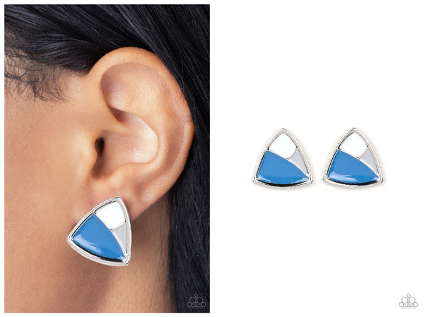 A collision of Skydiver, Northern Droplet, and white painted accents beam inside an asymmetric triangular frame for a contemporary pop of color. Earring attaches to a standard post fitting.