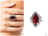 Dotted in dainty hematite rhinestones, folds of silver gather around an oversized marquise cut red gem for a gritty display of glitter atop the finger. Features a stretchy band for a flexible fit.