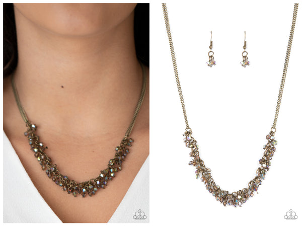 Dainty brassy tone-on-tone iridescent beads swing from doubled brass chains, creating a clustered fringe below the collar. Features an adjustable clasp closure.