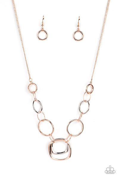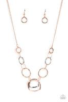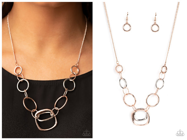 A mismatched collection of rose gold rings and asymmetrical silver hoops delicately links below the collar, resulting in a modern industrial display. Features an adjustable clasp closure.