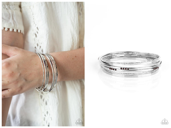 Encrusted in sections of glittery purple rhinestones, a mismatched collection of sparkly, smooth, and textured silver bangles stylishly stack up the wrist for a standout look.