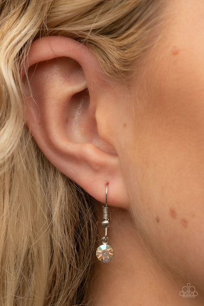 An iridescent heart-shaped gem is pressed into a simple silver frame at the end of a silver box chain creating an adorable sentiment below the collar. Features an adjustable clasp closure.