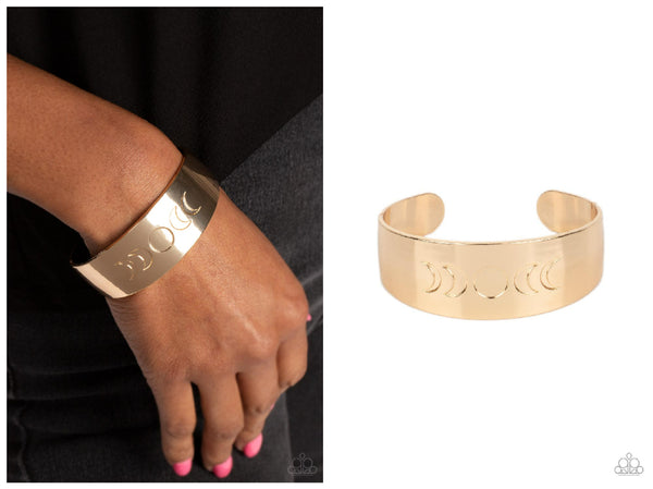 The phases of the moon are engraved across the front of a thick, shiny, gold cuff, creating an effortlessly celestial statement piece.