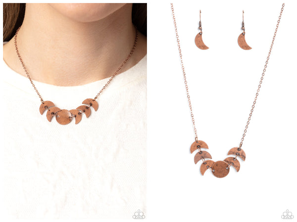 A stellar collection of copper discs, shaped to look like the phases of the moon coalesce below the collar for an out-of-this-world statement. Features an adjustable clasp closure.